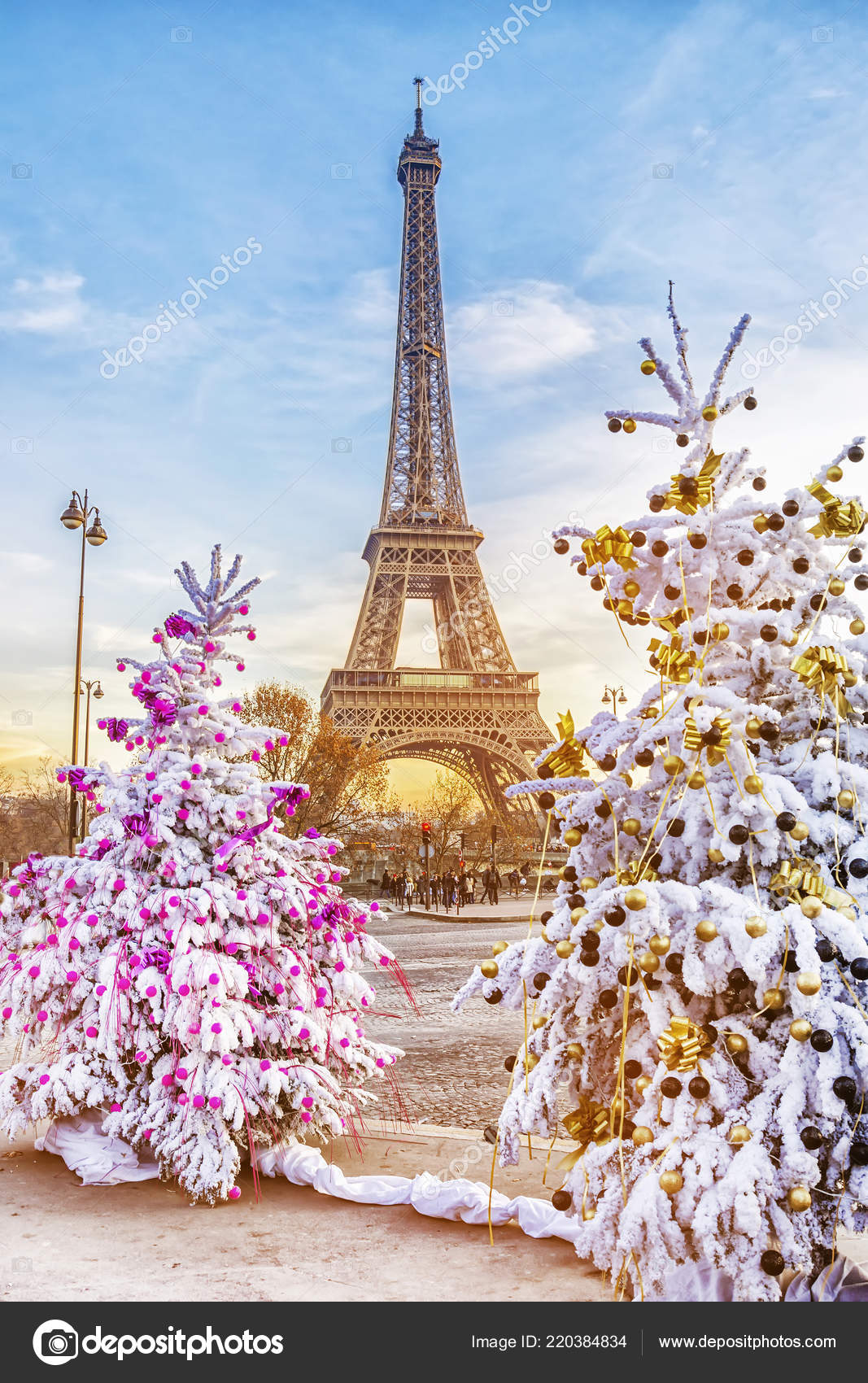 Eiffel Tower Main Attraction Paris Background Frosty Christmas Trees Covered Stock Photo By C Marina99 220384834